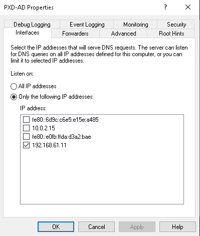 Open the DNS Manager and check the properties of the DNS server PXD-AD. Only 192.168.61.11 should be enabled as a listening IP address.