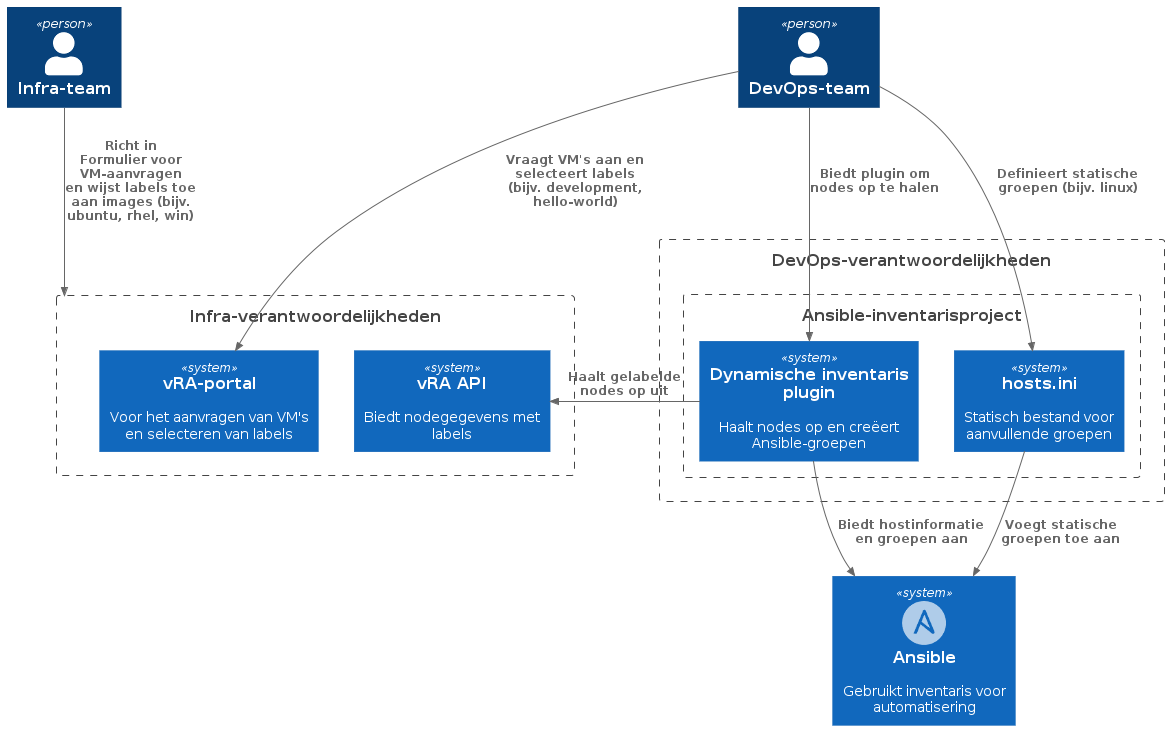 development,test,acceptance,production) en applicatierol-labels (bijv.hello-world) via het portal. - Het DevOps-team gebruikt een Dynamische inventaris plugin om gelabelde nodes op te halen uit de vRA API, waarbij hostinformatie en Ansible-groepen worden gegenereerd.