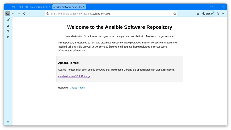 Als je op de link voor apache-tomcat-10.1.19.tar.gz klikt, zou de tarball moeten worden gedownload. Dit demonstreert dat de GitLab Runner de pipeline succesvol heeft uitgevoerd, inclusief het publiceren van een GitLab Pages-website die een software repository implementeert met behulp van Git LFS en GitLab Pages.