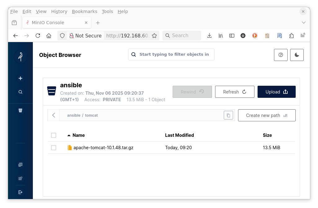 Na het inloggen zou je de bucket ansible moeten zien met het bestand